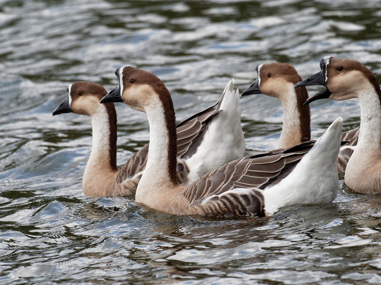 Vers 18h j'aperçois une escadre de 4 oies, 2 mâles et 2 femelles qui naviguent en formation très serrée, à 19h elles sont toujours là. J'ai fini par découvrir que ce sont des oies cygnoïdes, espèce typiquement asiatique, facilement reconnaissables avec leur bec noir et la bande blanchâtre qui encercle la base du bec Elles sont très probablement échappées d'un élevage.