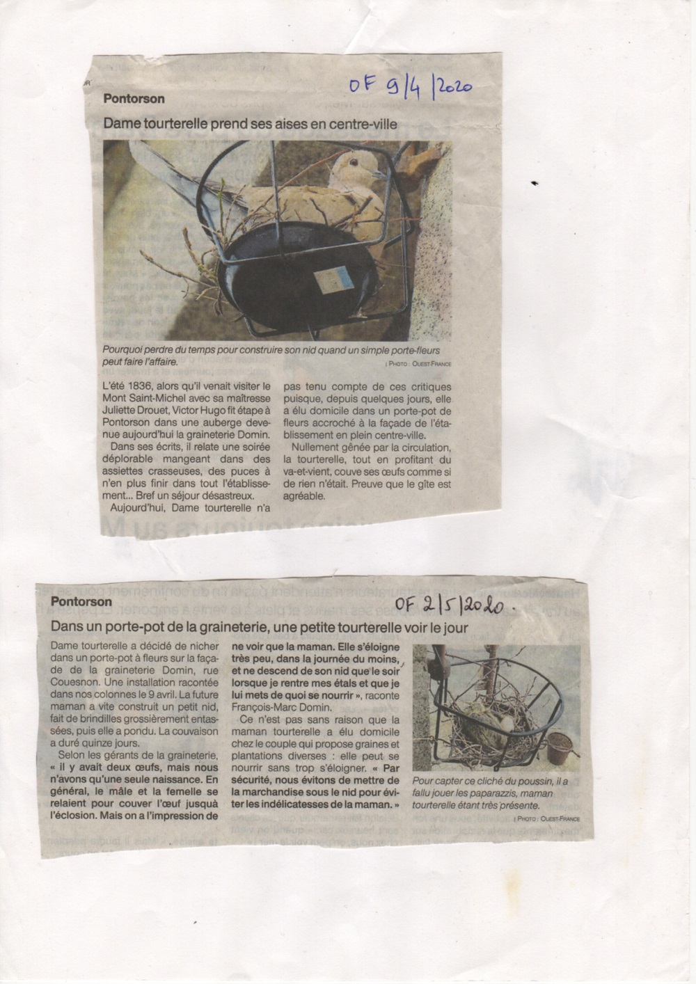 article paru dans Ouest-France du 9 avril et 2 mai derniers relatant la nidification de la tourterelle turque dans un porte pot de fleur en plein centre ville de Pontorson.