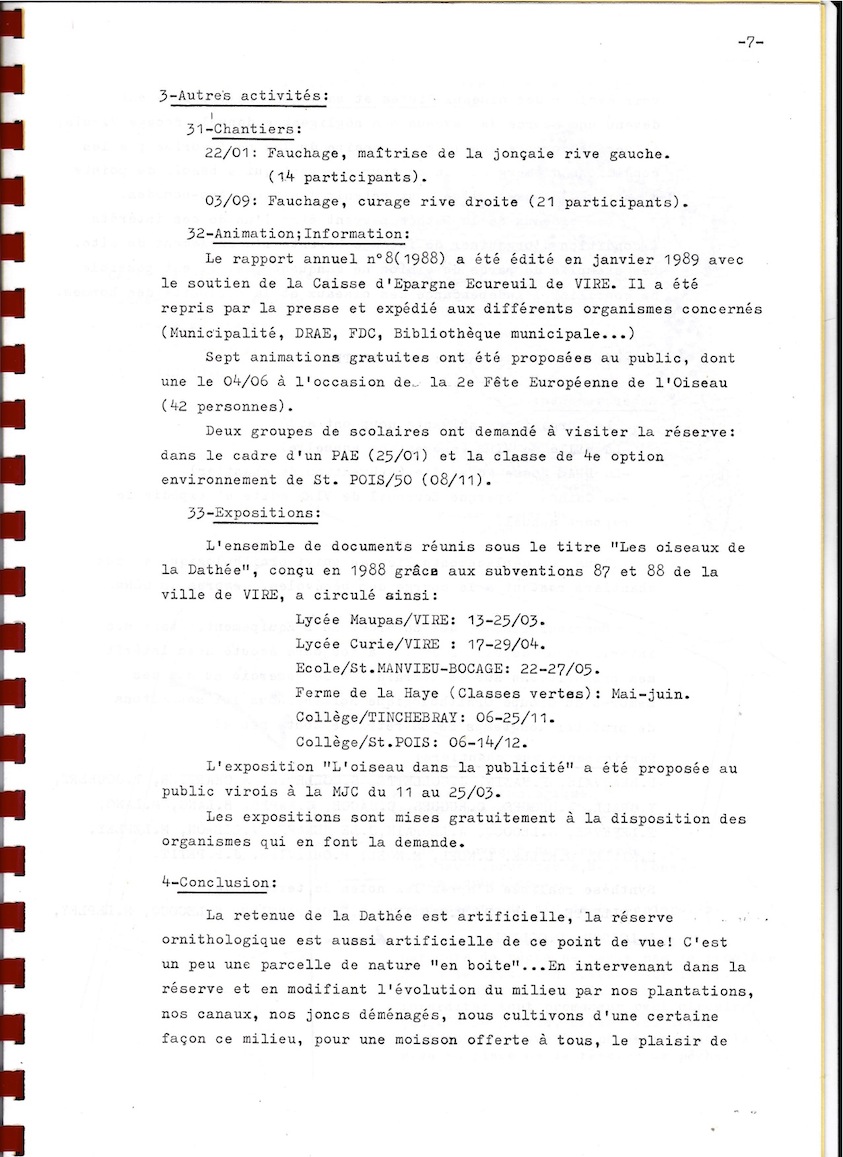 Ce document d'archive est publié in extenso de façon à faire comprendre comment à la fois un réseau d'observateurs et de participants aux chantiers s'est monté sur un site finalement de petite taille, mais aussi comment le GONm a pu créer des liens constructifs au sein de la collectivité viroise (élus, associations, établissements scolaires, bibliothèque, presse locale...) alors que nous avions peu ou pas de relais locaux, ce handicap étant resté un frein encore actuellement au bon développement de la réserve.