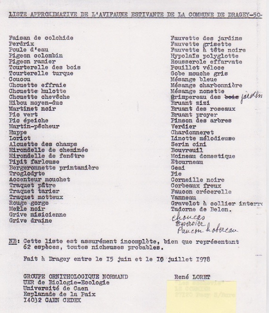 1974 08 06 - René Loret - Fontaine-sous-Jouy - Eure - 1974 08 06 - Fontaine-sous-Jouy - le Cormier - Eure- Observations - René Loret - Jean Collette - 1978 02 02 - René Loret - baie de seine - roselière - courrier - /color] 1978 07 00 - René Loret - baie de Seine - roselière - mésange à moustache - port autonome - courrier - 1978 08 02 - René Loret - baie de Seine - mésange à moustache - presse - 1978 11 02 - 1 - René Loret - huppe - Dragey - courrier - mairie - 1978 11 02 - 2- René Loret - Dragey - liste nicheurs - courrier - mairie - 1979 02 00 - René Loret - harle - 1989 07 11 - 1- René Loret - grive musicienne - mortalité - hivers froids - 1989 07 11 - 2- René Loret - grive musicienne - mortalité - hivers froids -