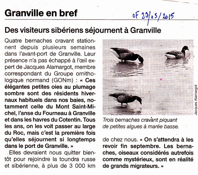 Cet article consacré au stationnement de bernaches dans l'avant-port de Granville est paru dans la Manche Libre , il y a quatre semaines. Il est réapparu dans la rubrique granvillaise de l'édition quotidienne de Ouest France avec cette fois-ci le nom de l'auteur de la photographie.