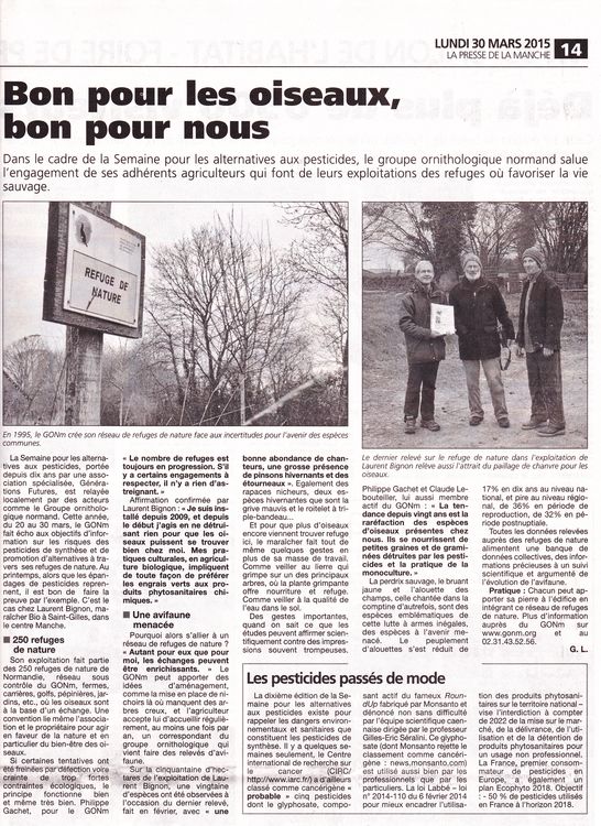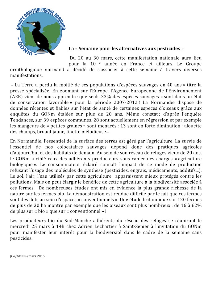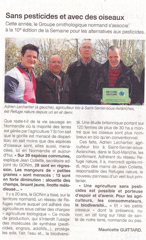 Il est paru un peu tard mais il se révèle très complet et bien documenté. Depuis le début de l'année, à l'occasion de chaque journée particulière pour laquelle le GONm avait organisé des animations ou des rencontres avec la presse, la Presse de la Manche a publié un papier d'une demie page sur le sujet concerné. Ce fut le cas pour la journée des zones humides, pour la journée mondiale des forêts et pour la semaine pour les alternatives aux pesticides. Cela valait le coup d'être signalé.