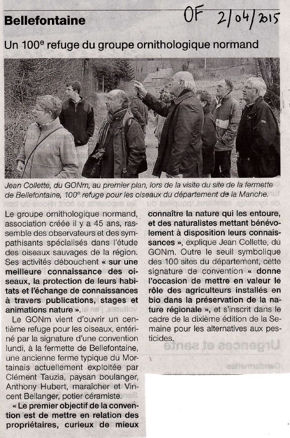 Ce refuge situé à Bellefontaine dans le Mortainais a été inauguré le 30 mars 2015. C'est une exploitation agricole regroupant, un paysan boulanger, un maraîcher et un potier céramiste. L'agriculture biologique étant seule pratiquée ici, c' était aussi l'occasion d'inscrire l'évènement dans le cadre de la dixième semaine pour les alternatives aux pesticides (du 20 au 30 mars 2015).