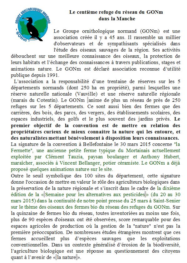 La rencontre avec la presse a eu lieu chez Adrien Lechartier, agriculteur bio adhérent du GONm depuis 2014. Les inventaires actuellement menés sur les 16 refuges bio donnent une liste de 91 espèces d'oiseaux, beau score si l'on précise que ces espaces représentent un échantillon d'habitats assez banals, essentiellement le bocage.