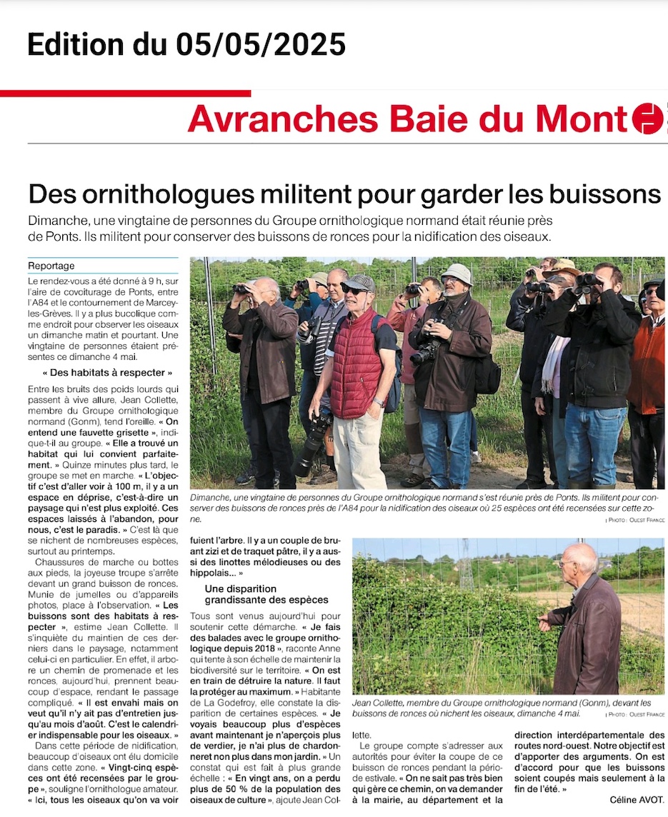 Une animation GONm sur les oiseaux des haies menée par Sophie et Guy aura lieu à Montviette le 18 mai 2025 à 9h30, rendez-vous sur le parking de Montviette. Sur réservation : 02 31 20 64 19 montviettenature@gmail.com.
