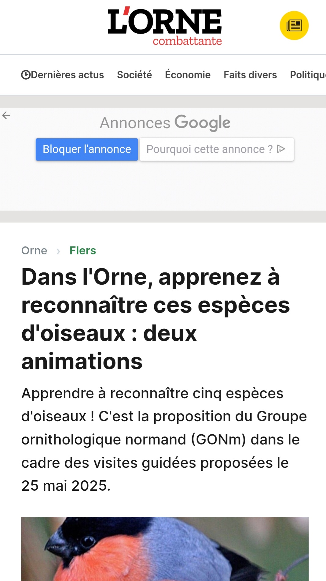 Et un article de l'Orne Combattante où se déroulait deux animations" Fête de la nature" , un article en son début et en sa fin (article numérique en de nombreuses parties truffées de publicités). Dommage l'article était complet et très informatif sur le GONm. Ci-après le lien, pour le lire dans son entièreté. https://actu.fr/normandie/flers_61169/d ... 60322.html