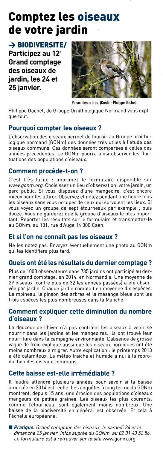Cette annonce du Grand Comptage des Oiseaux de Jardin, publiée sous forme d'interview, est parue dans Côté Manche, hebdo gratuit du Centre Manche. Elle fait suite à l'envoi d'un communiqué de presse aux organes de presse locaux.