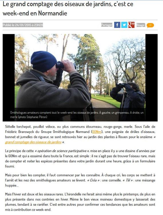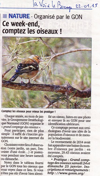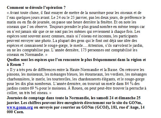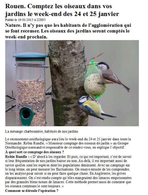 Deux articles sur le Grand Comptage des Oiseaux de Jardin, l'un extrait de Paris-Normandie, l'autre de Ouest-France Dimanche. Ces deux articles sont issus d'une rencontre avec la presse, soit lors d'une animation comme à Rouen, soit pour une interview sur un site d'observation comme à Saint-Lô.