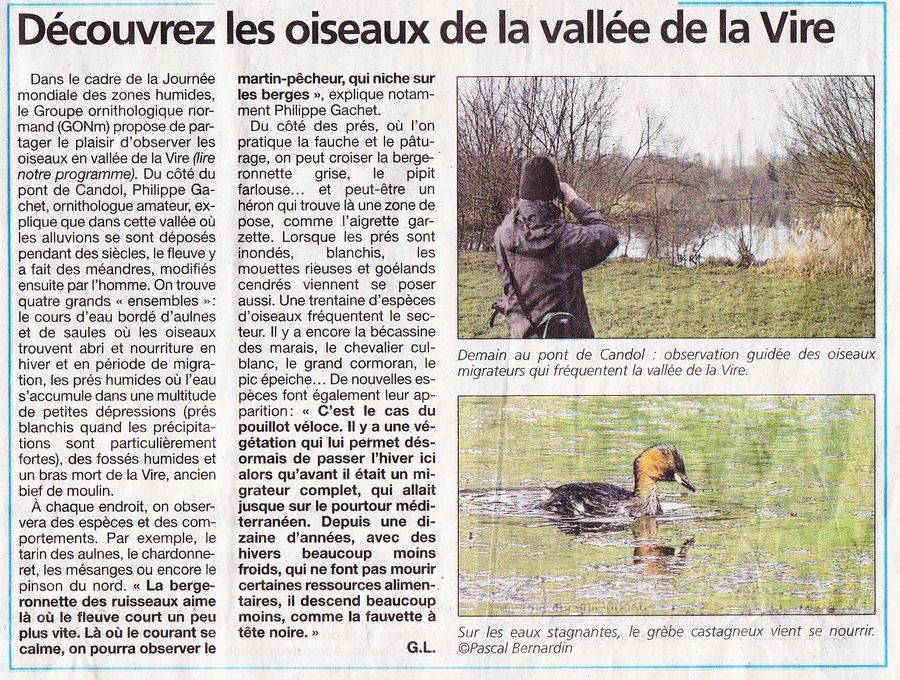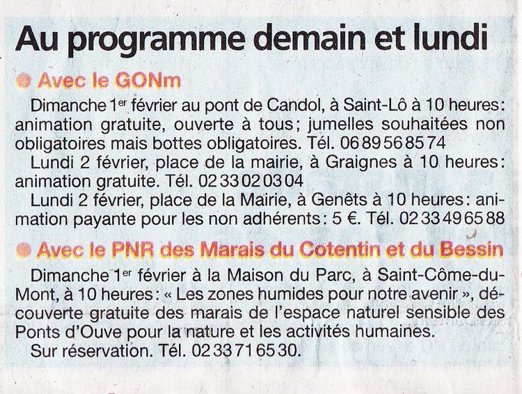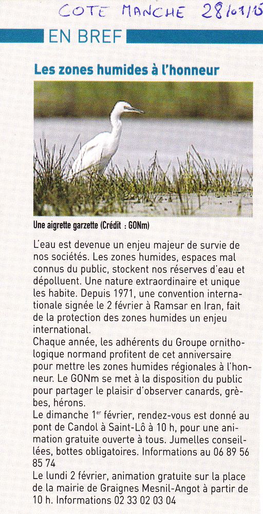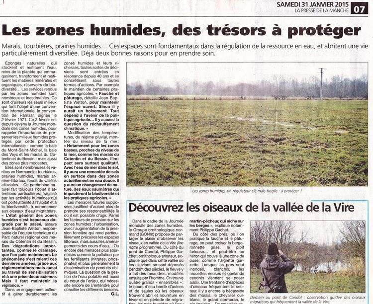 La Presse de la Manche du samedi 31 janvier 2015 a consacré une demi-page aux zones humides et à la Journée mondiale du 2 février. Le sujet est traité sérieusement et avec profondeur. Les apports scientifiques et historiques de notre collègue du PNR des marais ont été repris précisément. L'encadré présente le site d'une animation du GONm en vallée de la Vire. Le programme d'animations dans le département est bien mis en évidence. Voilà un travail d'information louable!
