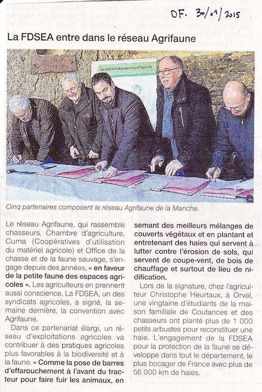 La FNSEA signe la convention "Agrifaune". On peut rêver de la mise en oeuvre de "pratiques agricoles plus favorables à la biodiversité", ce n'est pas interdit. Mais il est probable que beaucoup de lecteurs avertis seront restés pour le moins dubitatifs... Si la Manche porte encore 56 000 km de haies comme le dit l'article (123 400 km pour la Basse-Normandie, 1er rang national), cela représente bien des territoires de couples de petits passereaux! Mais aussi des milliers disparus avec les milliers de km de talus et haies arasés dans les années 1970...