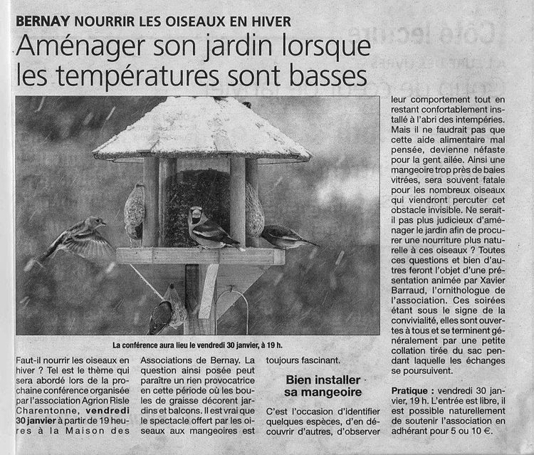 L'association "Agrion Risle Charentonne" proposait le 30 janvier 2015 à Bernay une conférence intitulée "Faut-il nourrir les oiseaux en hiver?" Xavier Barraud adhérent du GONm et animateur de sorties ornithologiques dans ce secteur présentait cette conférence. Quelques-uns de ses conseils avisés sont reportés dans cet article de l'Eveil Normand.