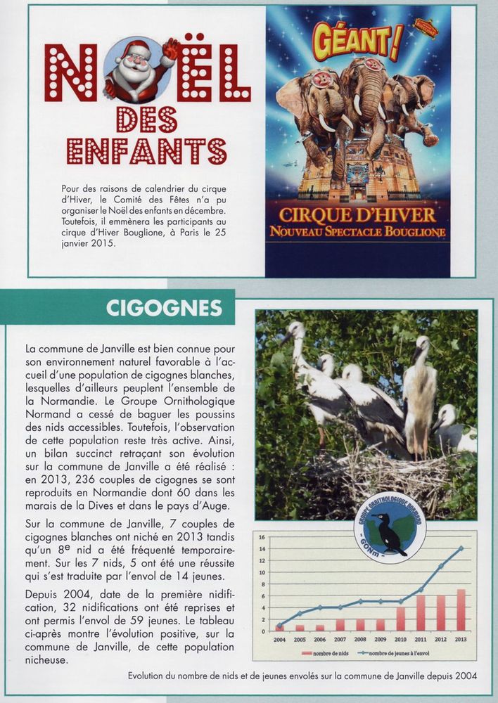 Le bulletin municipal d'une commune est un support de proximité bien pratique qui peut, soit annoncer des animations ornithologiques du GONm, soit rapporter une action en faveur de l'environnement menée par le GONm dans la commune. Ici à Janville, dans le Calvados, les cigognes sont à l'honneur dans un article certes court mais qui apporte de la connaissance.