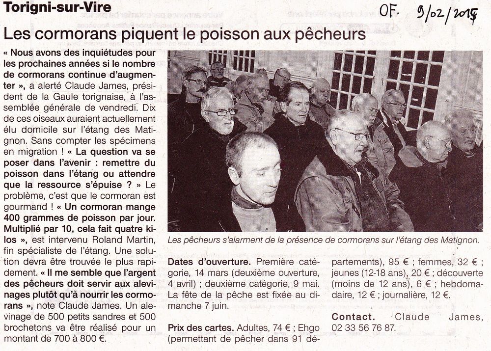 Ouverture de la pêche oblige, le grand cormoran fait parler de lui, ici, à Torigni sur Vire. Question d'un de nos collègues bien connus "Qui va faire un courrier pour exiger que le poisson lâché soit bio pour ne pas empoisonner les cormorans?"
