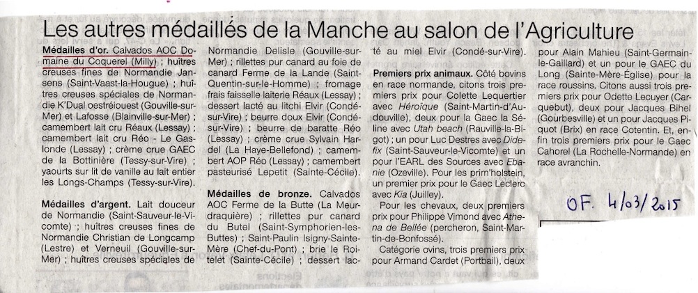 Le Domaine de Coquerel, distillerie installée à Milly (Sud-Manche) vient de recevoir une des médailles d'or du salon de l'agriculture.