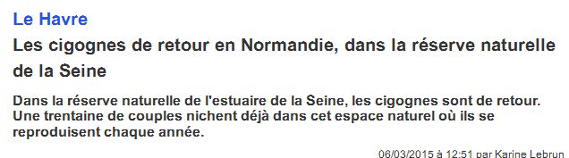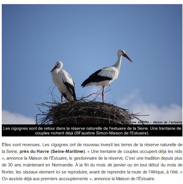 Dans Paris-Normandie numérique, un article annonce le retour des cigognes sur leur site de nidification de la réserve de naturelle de la Seine. Il rappelle à bon escient qu'en 2014, 16 mâts des plates-formes supportant les nids avaient été abattus par des personnes "indélicates". L'enquête suit son cours ...