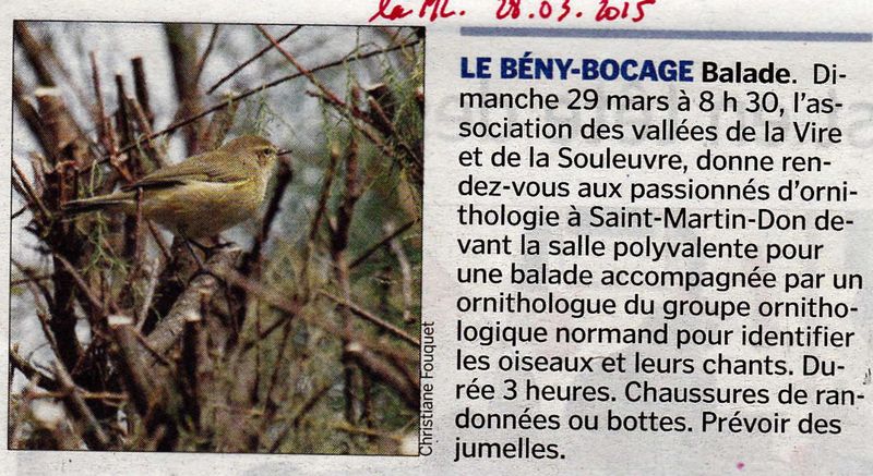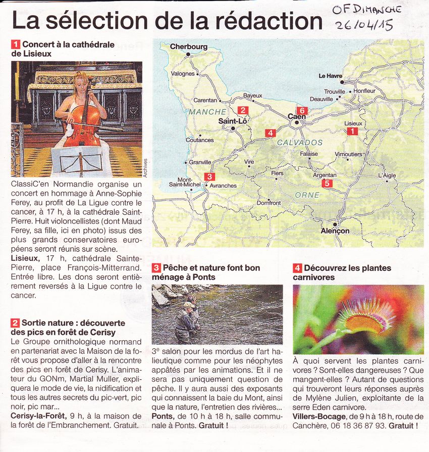 Chaque dimanche, Ouest-France Dimanche, édition bas-normande, offre à ses lecteurs une sélection de sorties ou d'événements. Dimanche dernier, 26 avril 2015, la sortie organisée par la Maison de la Forêt et animée par le GONm a été mise en avant.