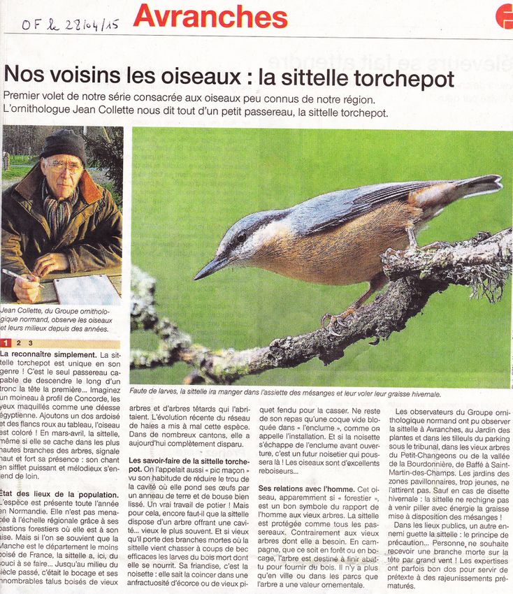 Les relations suivies entre nos collègues du Sud-Manche et la rédaction locale de Ouest-France ont abouti à la création d'une rubrique temporaire consacrée à des oiseaux communs de la région. La sittelle présentée ici avec rigueur et humour par Jean Collette sera suivie par 3 autres espèces. Les illustrations sont signées par des adhérents-photographes du GONm (ici, Jacques Rivière). Super!