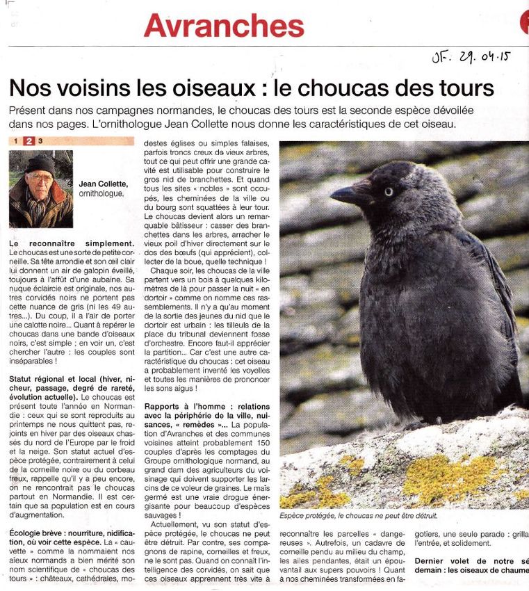 C'est maintenant au choucas des tours d'être mis en en lumière par Jean Collette dans Ouest-France : il en a sûrement besoin!
