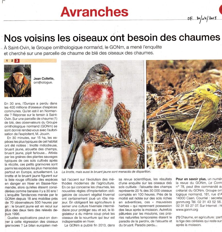 Le troisième volet de cette chronique avranchinaise est consacrée aux oiseaux des chaumes. C'est un article qui avait déjà été publié dans ce même journal, il y a quelques mois. Il permet de se questionner sur des pratiques qui peuvent paraître vertueuses mais qui, paradoxalement, sont peu favorables aux oiseaux. Si les pratiques agricoles avaient été au cours des dernières décennies plus douces et plus respectueuses de l'environnement, de l'eau et des sols notamment, ce genre de mesures "obligées" n'aurait sûrement pas été nécessaire.