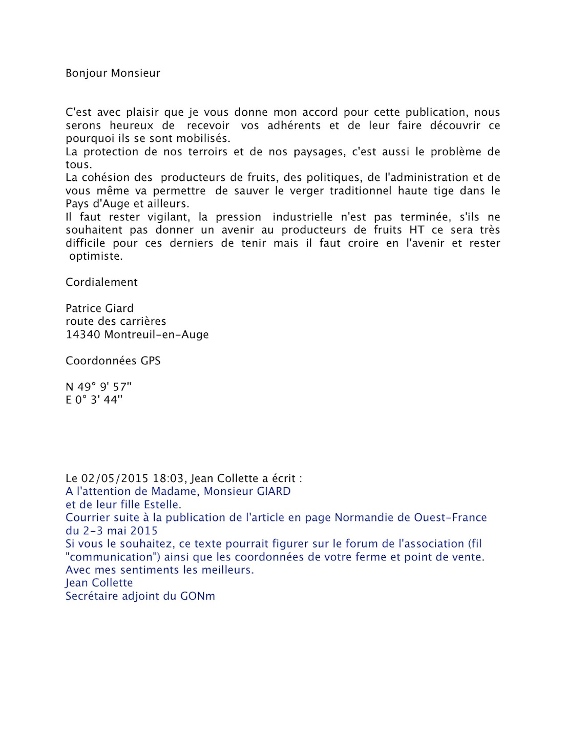D'où un échange de courriers destiné à rappeler à M. Giard que les naturalistes restent attentifs à l'actualité du verger normand... Sa réponse reste prudente quant au futur, nous devrons nous aussi rester vigilants au nom des rougequeues à front blanc, des chevêches, des nonnettes du bocage, etc.