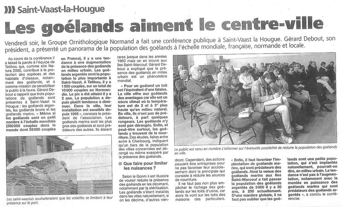 Cet article rapporte correctement les propos tenus par Gérard Debout dans sa conférence sur les goélands. Il fait le point de la connaissance et en reste au point de vue scientifique. Aucun esprit polémique ne ressort de ce compte-rendu : des réponses aux problèmes posés par les goélands dans le bourg de Saint-Vaast sont suggérés sans dramatisation.