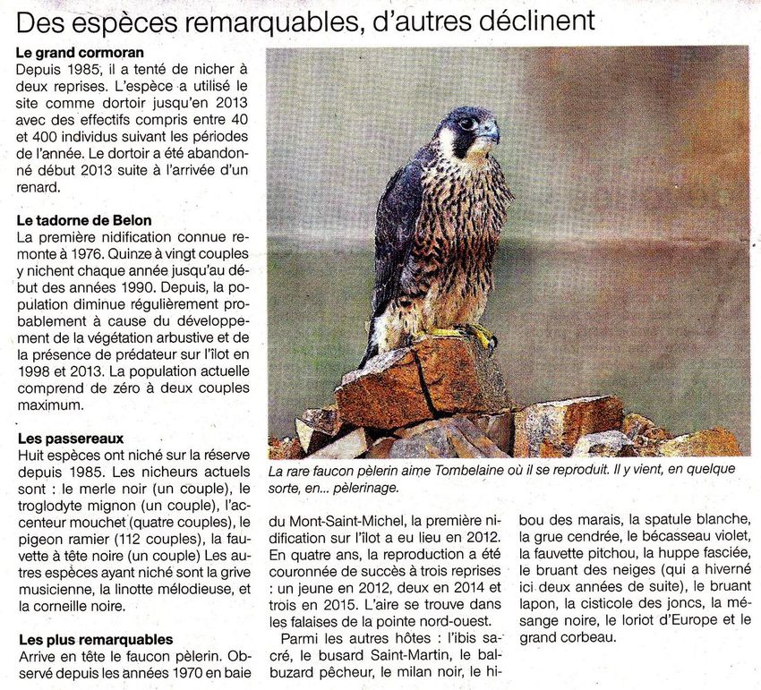 Le message 272 présentait une page consacrée à Tombelaine dans Ouest-France Avranches. Voici les deux articles concernant cette réserve du GONm avec un historique , des informations sur l'évolution et la gestion du site ainsi qu' un panorama complet de l'avifaune du rocher. Une bonne approche de ce site pas si connu que cela du public et des ornithos et l'occasion aussi de saluer le beau travail effectué en 30 ans par le conservateur et les bénévoles.
