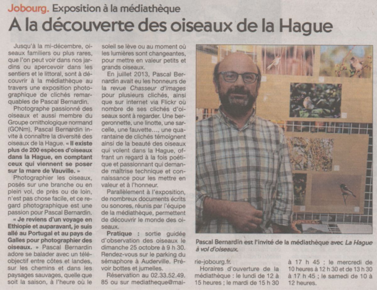 L'exposition de notre collègue photographe Pascal Bernardin "La Hague à vol d'oiseaux" est toujours visible à la médiathèque de Jobourg jusqu'au 15 décembre. Les horaires d'ouverture sont indiqués dans l'article de la Presse de la Manche, ci-dessous. Une animation liée à cette exposition est organisée le 25 octobre, à Auderville, à 9h30. Réservations au 02 33 52 49 85.