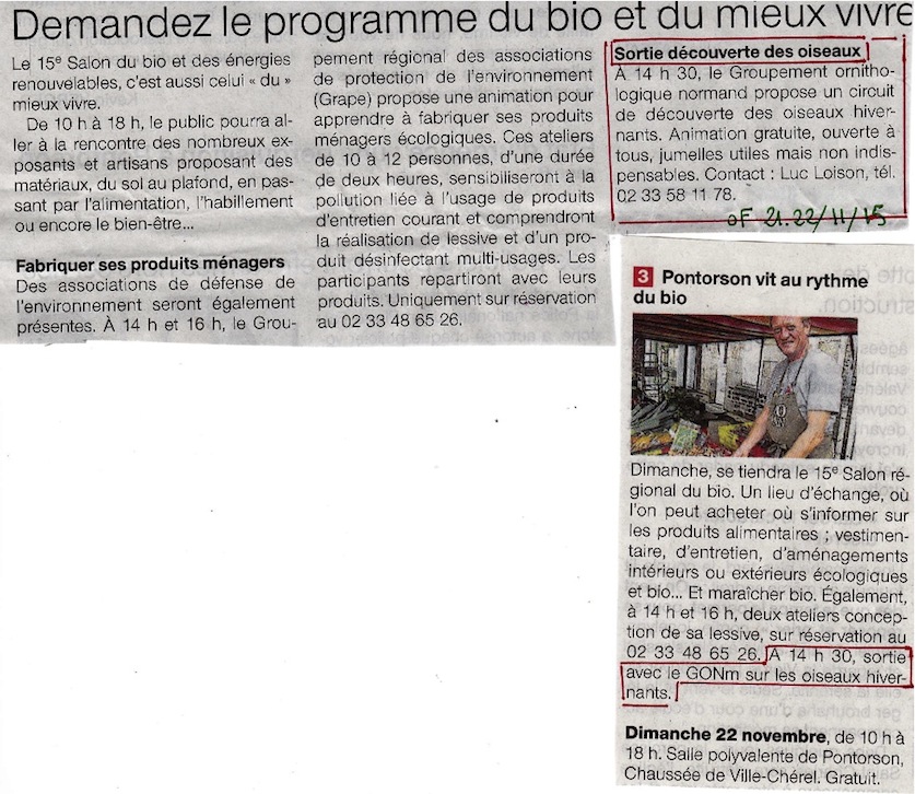 L'autre moteur qui nous pousse à participer est plus anecdotique mais néanmoins à ne pas négliger. Dans la mesure où pour une part, nos objectifs de protection dépendent parfois de la prise de conscience des enjeux par les décideurs, élus ou administrations, nous devons être visibles dans le champ social. Et toute occasion est bonne à prendre si elle est arrimée à une action positive. C'est pourquoi nous devons être attentifs aux engagements des organisateurs : nous participons donc nous devons être cités au minimum comme partenaires. La demande peut paraître puérile, mais c'est aussi la façon d'être "remerciés" de notre investissement bénévole. Cette évidence n'est pas toujours claire pour certaines structures qui "nous utilisent". Ce n'est pas le cas des organisateurs du salon Bio de Pontorson avec lesquels nous collaborons depuis longtemps, en confiance.