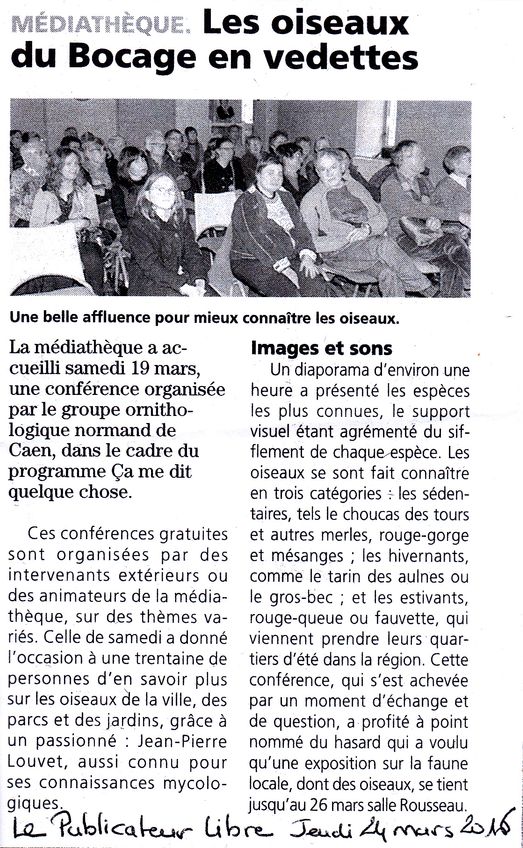 Dans le cadre de son programme d'animations, la nouvelle médiathèque de la Ferté-Macé a organisé le 19 mars 2016, une conférence sur les oiseaux des parcs et jardins. Un diaporama a été présenté et commenté par Anne-Marie Vallée et Jean-Pierre Louvet du GONm. Comme on peut le voir, cette conférence a rencontré un bon succès public. D'autres animations sur les oiseaux sont d'ores et déjà envisagées.