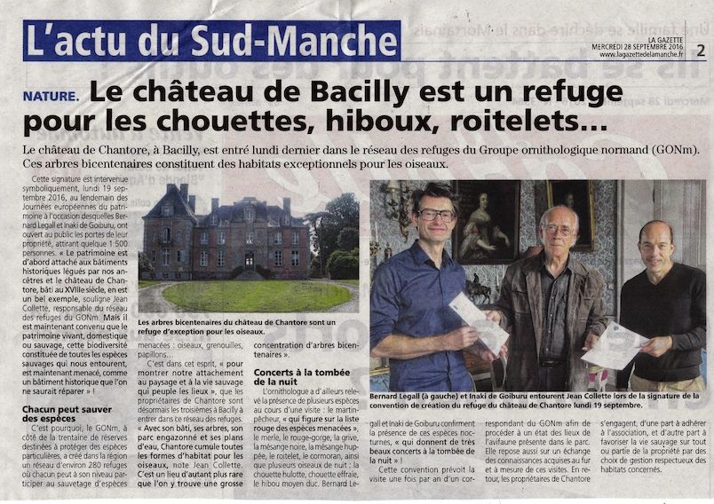 Ce nouveau refuge se trouve dans le château de Chantore à Bacilly/50, près d'Avranches. Entouré par un parc très boisé avec de nombreux arbres bicentenaires, le site est un lieu très riche en oiseaux. La Gazette de la Manche et la Manche Libre se font écho de cette inauguration.