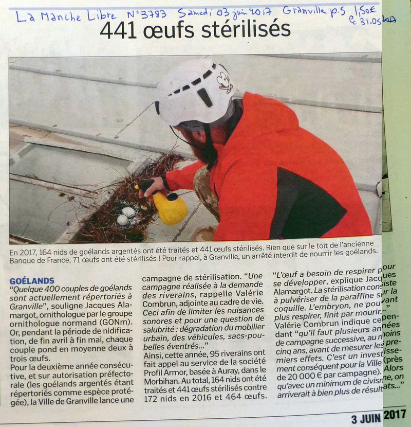 Quand les goélands font la une des journaux, c'est rarement pour leur tresser des lauriers. La campagne de stérilisation des oeufs a donc débuté à Granville/50. Jacques Alamargot,notre collègue du GONm, suit cela de près et est sollicité régulièrement par la municipalité et la presse pour ses conseils. La photo de "une" n'est pas créditée mais elle est de lui.