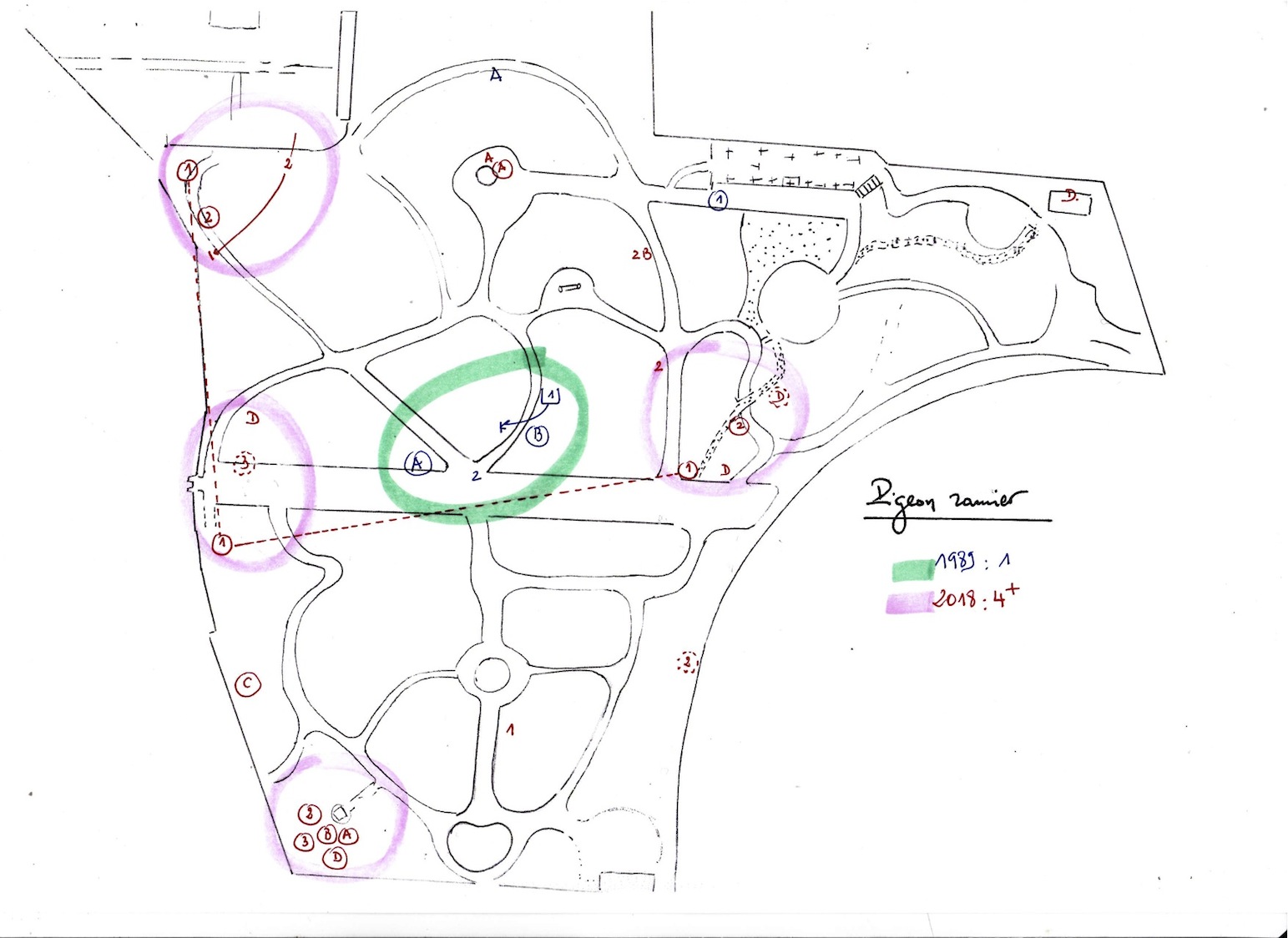 Les cartes de mai 1989 ont servi de base à la comparaison avec mai 2018. Attention, les comptages sur une seule matinée n'ont qu'une valeur indicative, mais la bonne concordance des principales tendances avec celles plus généralement admises ailleurs donne probablement confiance dans les résultats. Le tableau récapitule les variations: pour chaque espèce, à partir des 5 cartes de chaque année, la moyenne du nombre d'individus comptés sert de base à la comparaison. Pour celles qui sont bien représentées (par exemple le pigeon ramier), on peut aller jusqu'à proposer le contour des territoires. Pour les espèces peu représentées, les variations sont probablement moins significatives.