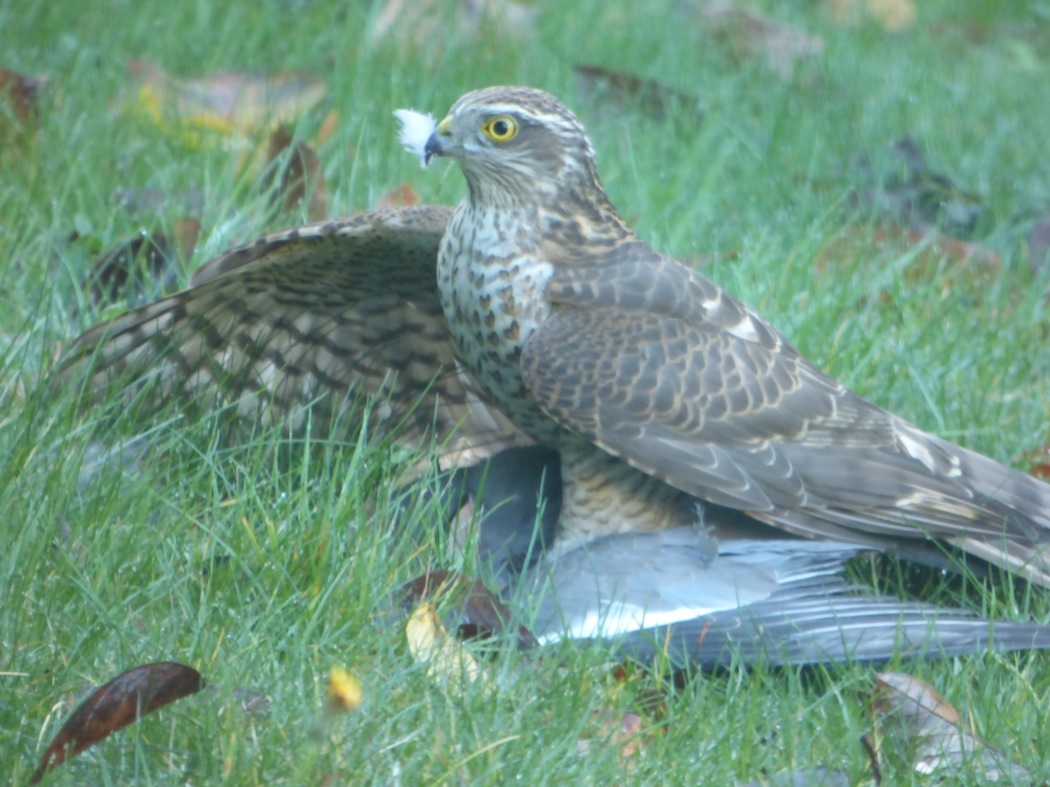 Hier 13 novembre, en rentrant à 11 heures, j'interromps "la mise à mort" d'un pigeon ramier sur la pelouse du jardin par un épervier qui ne peut déplacer sa proie trop lourde, encore "un peu" vivante. Sans sortir du véhicule, je laisse faire le prédateur qui donne quelques coups de bec mais visiblement attends que la proie cesse de bouger. La suite, ce sera une série de dérangements comme aux abords de toute habitation. L'épervier finira son repas vers 17h00, en plusieurs étapes, revenant à chaque fois sur la pelouse, un peu à l'abri sous un gros hortensia. Quelques plumes en moins, l'attaque des pectoraux, et de la tête et du dos (l'épervier connais bien la chanson "Alouette, je te plumerai...")