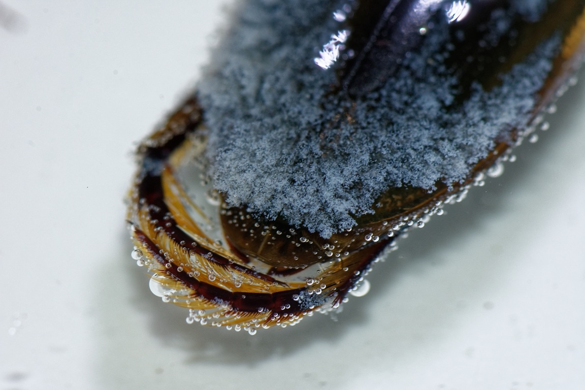 Lors du dernier passage de son ami naturaliste Benoit Baudin, le prélèvement a fourni une observation peu banale : sur les élytres d'un coléoptère (Dytiscus semisulcatus, détermination confirmée par JF Elder), une "mousse" blanche" attire l'attention : un protozoaire Cilié vivant sur le coléoptère; ce n'est pas un parasite, il vit seulement en "épibionte".