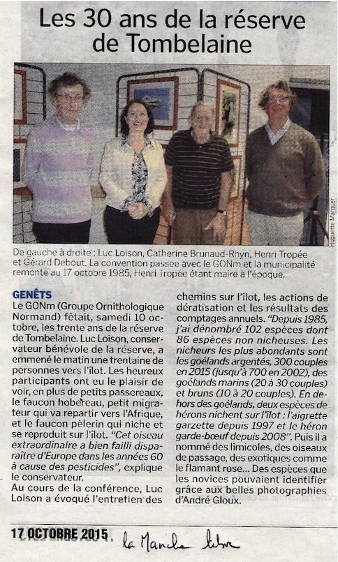 17 octobre 1985, signature de la convention créant la réserve ornithologique de Tombelaine : Luc Loison est resté fidèle au poste contre vents et marées (au sens propre comme au sens figuré). Je me souviens de l'époque où nous dénichions les vieux tuyaux de poêles dans les décharges (le bon temps des ordures libres d'accès ...Comment dit on "humour" en langage des signes?) pour ensuite les emporter sur Tombelaine afin de déposer les appâts empoisonnés destinés aux rats à l'abri de la gourmandise suicidaire des goélands.