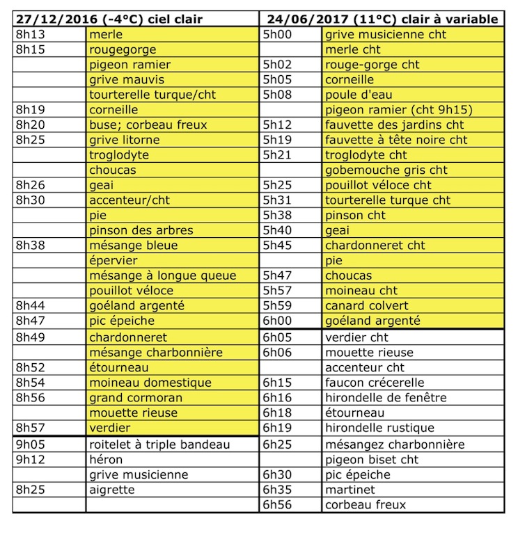 Depuis août 2016, tous les 10 jours, un relevé matinal à partir du lever du jour a lieu sur la parcelle en réserve. Entre le solstice d'hiver et celui de fin juin, bien des différences bien sûr; une nuance évidente : les oiseaux de l'hiver sont "pressés", les espèces qui se manifestent avant le lever officiel du soleil sont nettement plus nombreuses qu'en juin. Logique quand on met cette observation en face de la durée du jour tellement plus courte en décembre!