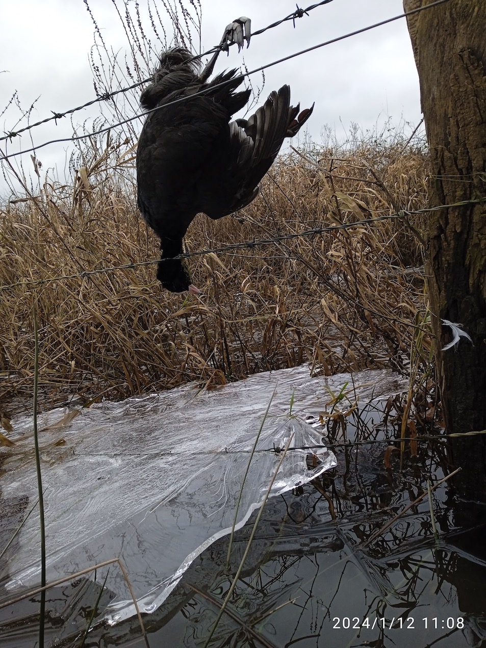 Ce matin, en compagnie de Paulo Sanson et Pierre Cudelou, comptage WI sur la réserve. Au loin, tache noire sur la clôture en bordure du gabion... Cadavre récent de foulque accrochée par l'aile à la pointe d'un barbelé de la clôture. Le niveau d'eau de l'inondation a peut-être atteint la hauteur de ce 3e fil de la clôture?