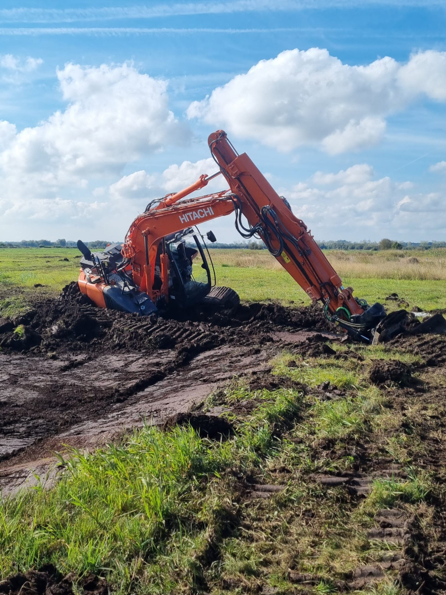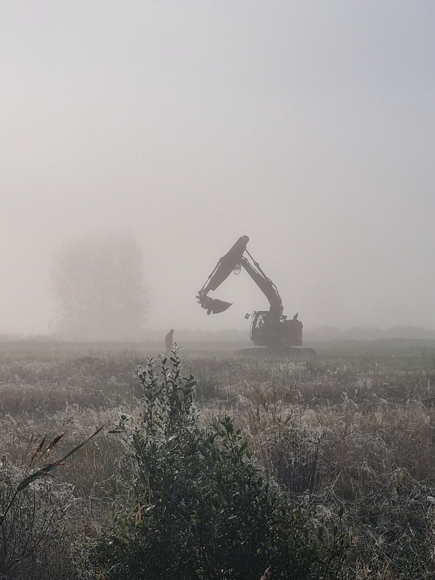 Création de chenaux sur la parcelle dite la Première Pièce Rigault (marais du Cap) dans le cadre du LIFE AWOM (Phragmite aquatique), non sans mal :
