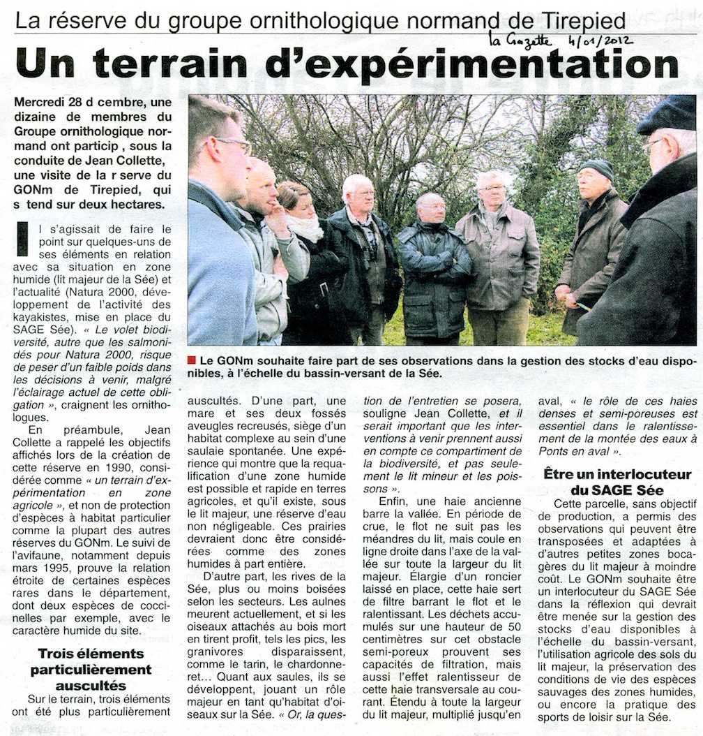 Suite et fin du bilan, remarques relatives à la gestion. Le positionnement du GONm doit être compris à la lumière de deux faits contemporains : d'une part à Ducey, une sablière proche du projet fonctionne déjà, et nous savons par expérience qu'elle favorise entre autres l'installation de nombreuses espèces d'oiseaux. La colonie d'hirondelles de rivage est remarquable. D'autre part, nous venons de signer en 1987 une convention en vallée d'Eure pour la création de la réserve de la Grande Noé sur le site d'une ancienne ballastière (granulats extraits des alluvions fluviatiles) et les 65 ha accueillent une grande quantité d'oiseaux, et des espèces rares au fil du temps. La teneur négative de l'avis déposé vient donc autant de la perte de prairies humides que du futur usage des plans d'eau engendrés par l'extraction du sable. Il est écrit dans les documents présentés au public : "La remise en état des plans d'eau permettra l'accueil d'une faune aquatique diversifiée" (p 87). Mais plus loin dans le "Rapport analytique", il est dit que ce projet pourrait être l'occasion de créer une base de loisir (voile, pêche, etc.) ce qui est par expérience en complète contradiction avec l'idée d'en faire un lieu d'accueil pour l'avifaune. D'où la conclusion du texte remis au nom du GONm sur le registre des avis en mairie de Poilley au nom du GONm. Finalement, le projet sera rejeté à nouveau par l'administration. Pour l'anecdote, un sujet fut tourné pour le journal télévisé régional, mettant en avant un argument qu'il faut reconnaitre un peu fallacieux : le mont Saint Michel à quelques kilomètres à vol d'oiseau (15 km...)