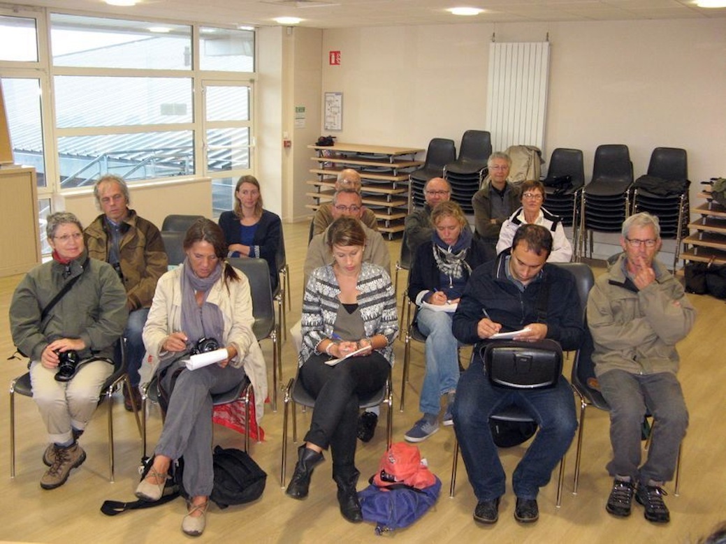 Trois témoignages transmis par Véronique. La foule écoute les discours officiels (élus, agence de l'eau) dont on retiendra surtout les données techniques sur l'épuration si parfaite qu'elle permet de mettre des moutons à pâturer sur la végétation de la zone d'infiltration. La volonté d'innovation architecturale esthétique du bâtiment technique ajoute à la réussite du projet. A nous de profiter de l'occasion pour participer au travail d'éducation qui peut accompagner le développement du site.