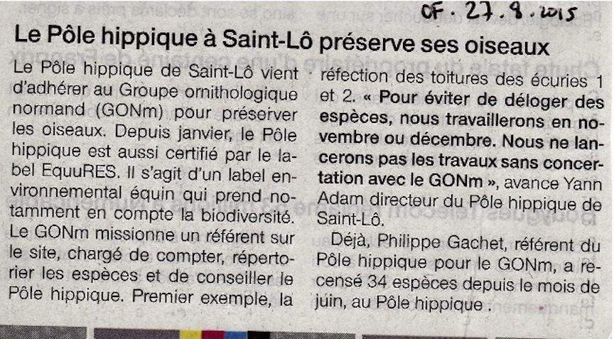 Ont participé à la sortie puis à l'inauguration Gilles Charlon, Nicole et Pierre Champeau, Didier Guillon, Andrée Lasquellec, Claude Lebouteiller et Jean Collette, accompagnant Philippe Gachet, correspondant, lors de son relevé d'avifaune. Le circuit a été l'occasion de découvrir un site riche de la variété de ses habitats : le parc ancien et les beaux bâtiments historiques visibles de la rue jouxtent le bocage en arrière, en partie aménagé pour les concours hippiques et l'entrainement. Le plus étonnant est que cette propriété est ouverte au public sans autre condition que d'être attentif aux chevaux qui circulent accompagnés.