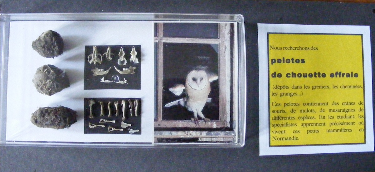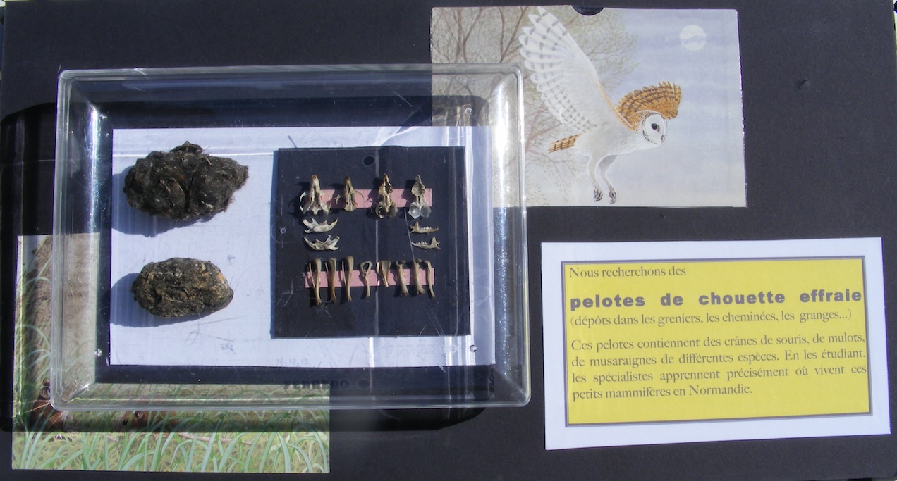 Certains de nos refuges sont des points de vente en direct du producteur au consommateur : les clients passent dans le local de vente régulièrement. D'où l'idée de placer en évidence une petite affichette illustrée sous forme d'un appel à témoignage de dépôt de pelotes. Nos collègues du Groupe mammalogique normand sont en cours de remise à jour de l'atlas des mammifères de Normandie et ils sont à la recherche de lots de pelotes afin de compléter les cartes de répartition des micromammifères.