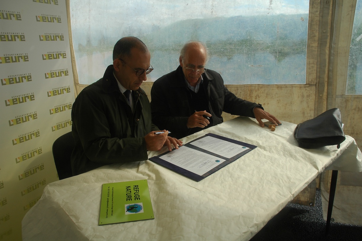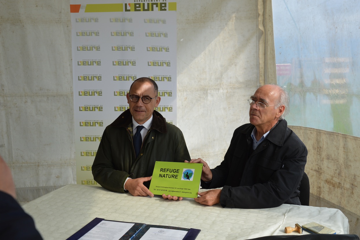 La convention a été signée il y a quelques mois mais il avait été décidé d'attendre que le planning estival du pôle bien chargé en manifestations s'éclaircisse... C'est donc mardi 25 que nous nous sommes retrouvés, huit adhérents du GONm, le directeur du pôle hippique, un représentant de la municipalité et la chargée de mission EquuRES du Conseil des chevaux de Normandie pour officialiser la création du refuge du GONm sur le site.