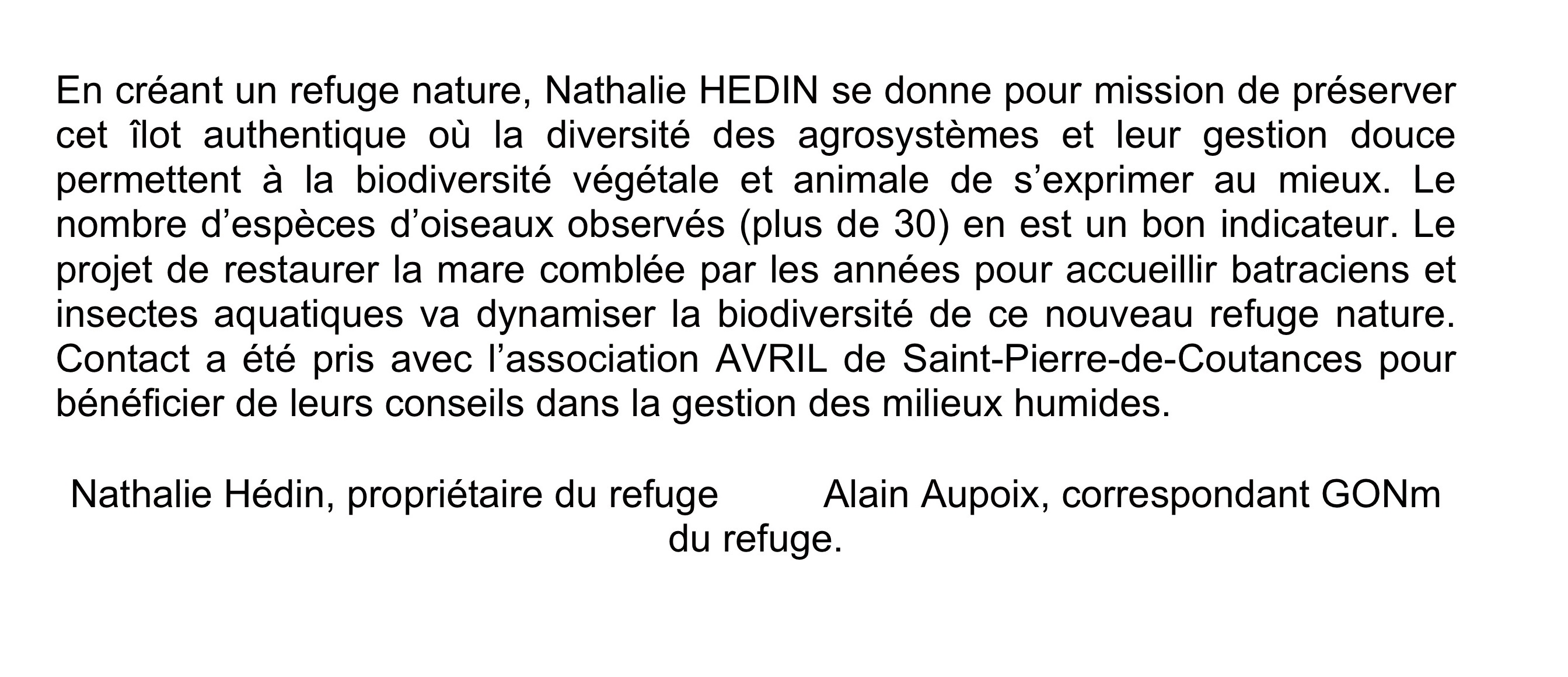 Nathalie Hédin, membre du GONm crée chez elle un refuge nature sur un espace de plus de 3 hectares. Vous êtes cordialement invités à cette inauguration qui se déroulera le samedi 10 septembre à 15 heures au 1D, rue de la Martinière sur la commune de Hyenville. Un pot sera offert à l'issue d'une balade découverte du refuge. Si vous pensez venir, merci de contacter Nathalie par mail : boyerhedin.nathalie@gmail.com Pensez aussi à apporter des chaussures de marche. Pour le 50ième anniversaire du GONm, ce nouveau refuge viendra étoffer le réseau.