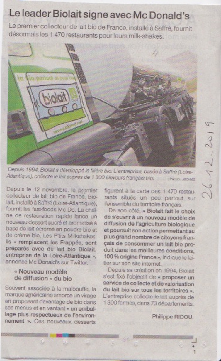 Ce message aurait pu être la suite logique du précédent, Adrien livre le reste de son lait non utilisé pour la production locale à Biolait, ce qui est le cas d'autres fermes bio du réseau des refuges du GONm. On se souvient des démêlés de José Bové participant au démontage d'un chantier de Mac Do à Millau. Un lien entre le bio et les fast-foods ne va pas de soi immédiatement vu la réputation "gastronomique" des établissement de restauration rapide.