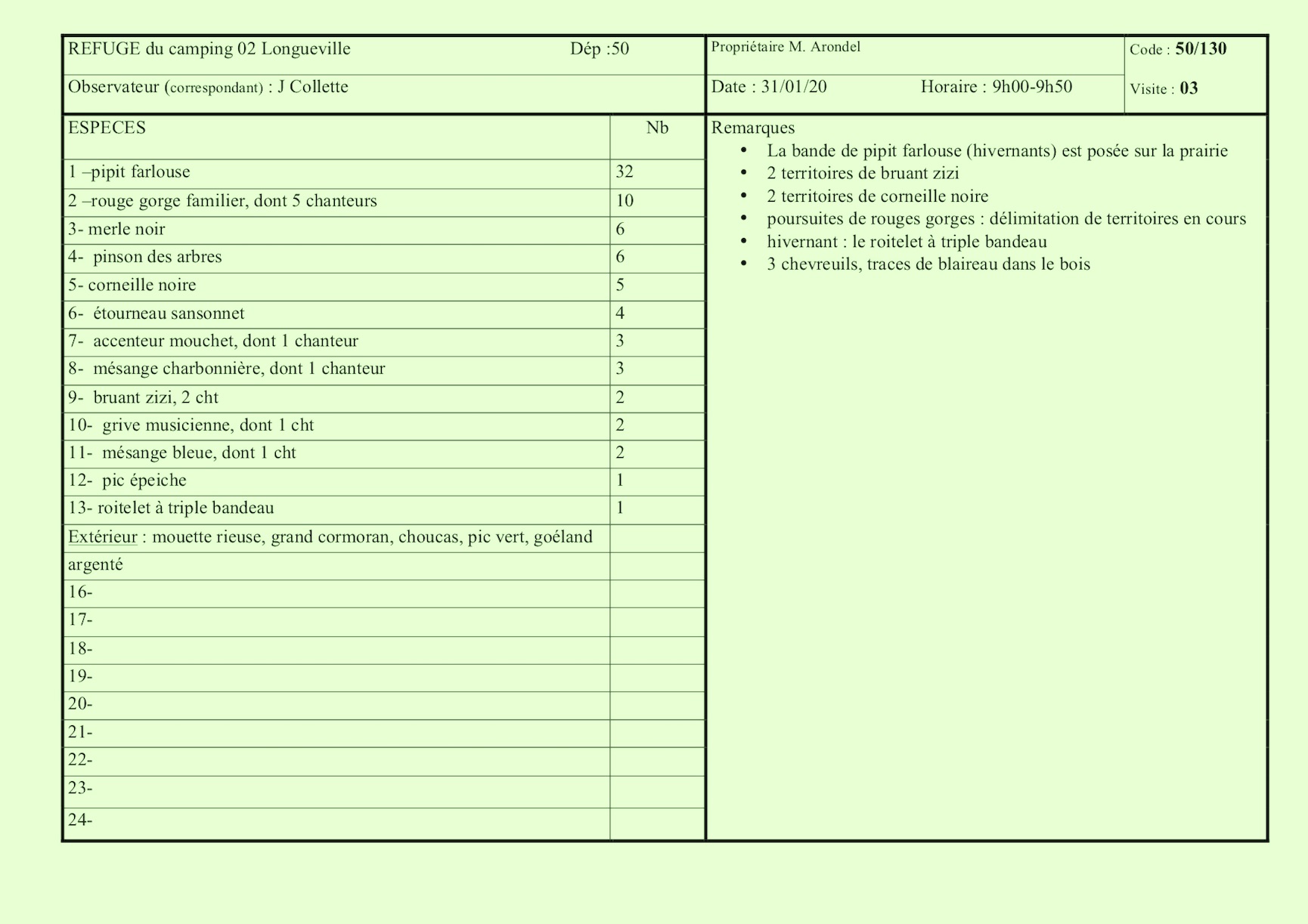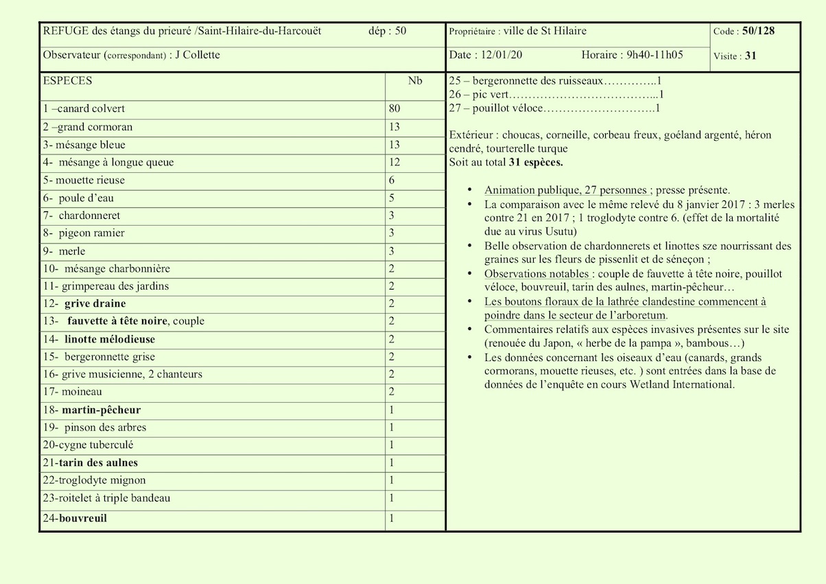 Un bilan est comme à chaque visite envoyé à la mairie de Saint-Hilaire-du-Harcouët, signataire de la convention refuge. L'intérêt de ce bilan est la comparaison avec celui du 8 janvier 2017 : Ce qui saute aux yeux, c'est la différence de population des merles comptés : 21 en 2017, 3 hier en 2020... De même, le troglodyte passe de 6 à 1... Usutu est passé par là. Par contre, bonne surprise, les mésanges bleues qui n'étaient que 1 (chanteur) en 2017 sont au moins 13 (dont 1 chanteur) en 2020 : merci les hivernants venus d'ailleurs!