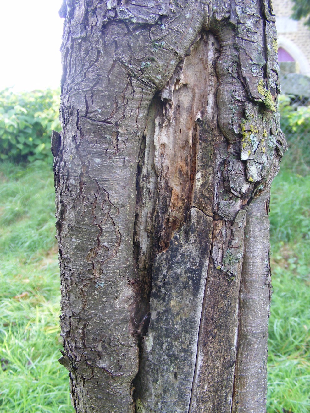 L'écorçage (sujet de l'article) engendre des plaies en fissures caractéristiques. Le bois de coeur attaqué par les champignons puis par les larves d'insectes devient une terrain de chasse pour les pics, les mésanges, la sittelle... Le tronc du pommier illustre particulièrement ce phénomène, d'une part à cause de sa vulnérabilité sous la dent du bétail, d'autre part vu la lenteur de la cicatrisation qui se traduit par les nombreuses cavités offertes par les vieux pommiers (vergers hautes tiges à défendre contre leur remplacement par les plantations intensives basses tiges!) L'article cité en début de message relève la relative rareté des nidifications à partir de ces fissures dans nos forêts, observation logique vu les pratiques d'entretien sélectif de nos forestiers. Cependant, en vieux verger, il est possible d'observer la nidification des mésanges dans cet habitat original. Le pic épeiche peut percer une seconde ouverture pour accéder aux larves et insectes du bois mort et de l'humus qui se forment dans la tronc creusé du pommier. Les pics savent reconnaitre les zones de fragilité engendrées par les écorces blessées et les creusent préférentiellement sur un tronc. Le bois de coeur attaqué à la fois par les champignons et les insectes des troncs creux constitue un habitat irremplaçable que tout refuge devrait chercher à favoriser, que ce soit un tronc mort ou mourant debout ou un tronc "en épave" couché. La rencontre au refuge de la Chauvinière (Bacilly/50) pour fêter les 20 ans de la convention ne pouvait pas mieux être immortalisée que sous le vieux cerisier amputé d'une grosse branche mais encore plein de vie sauvage. Merci à Gérard Debout pour la transmission de la référence bibliographique.