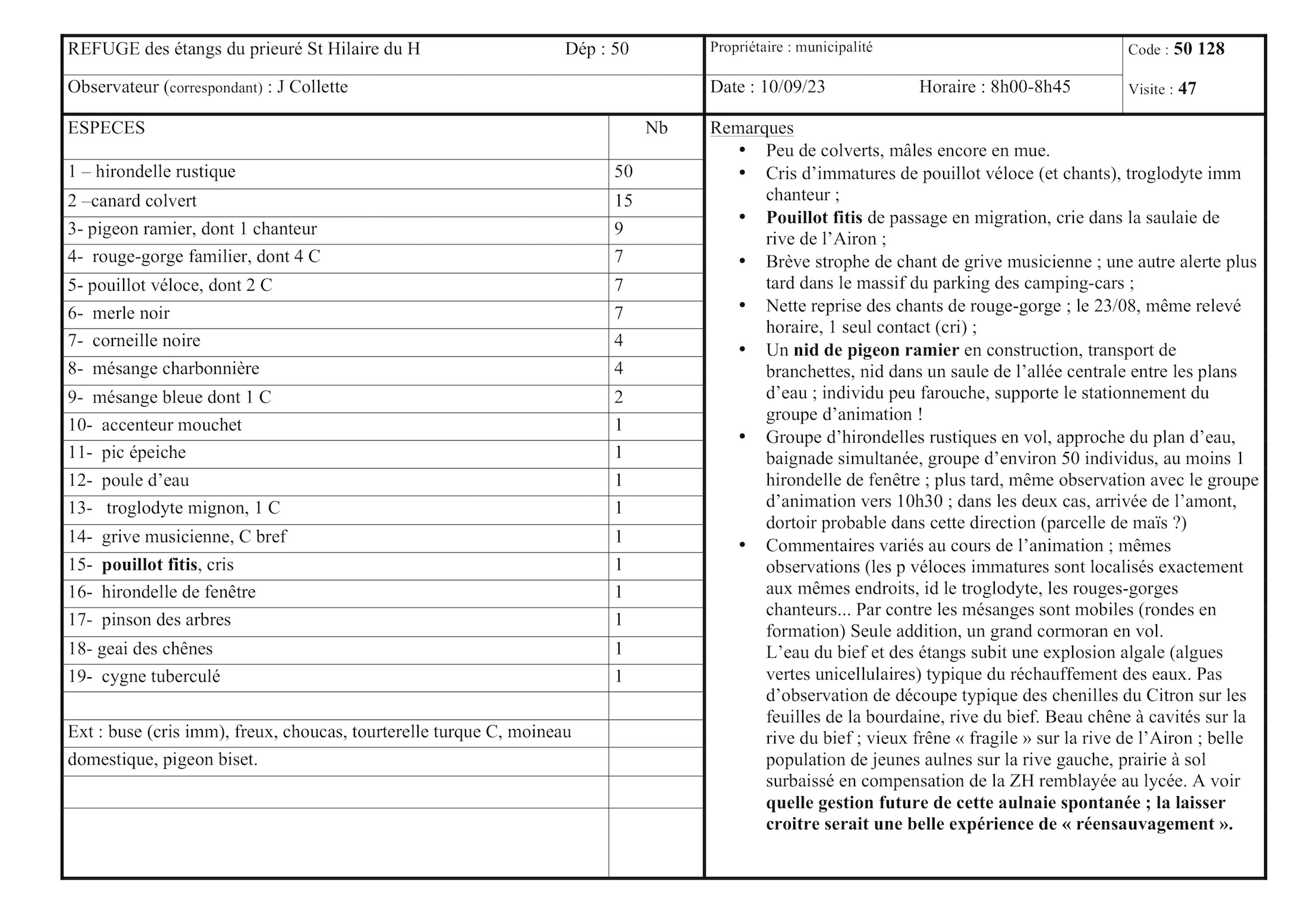 Après le raté du rendez-vous du mercredi 23 août (où l'animateur et le groupe attendaient en 2 lieux différents... voir article peu sympathique à fil communication, message 1215 à https://forum.gonm.org/viewtopic.php?f= ... 8721#p8721), une autre date avait été proposée au public le 10 septembre. Avant la sortie en compagnie des 13 participants, un relevé a été effectué à 8 h. Petit plaisir, le pouillot fitis est présent dans la ripisylve de la rivière l'Airon. Un pigeon ramier s'affaire à construire un nid dans un saule de la rive des étangs. Des bandes d'hirondelles viennent par vagues prendre un bain en surface. Les jeunes pouillots véloces crient et s'entrainent au chant pour certains. Une heure plus tard, ces observations seront aussi réalisées en groupe, exactement au même endroit pour certaines! Les véloces circulent peu ou pas en chassant sur des espaces finalement réduits. Seules les mésanges se déplacent plus ou moins en groupe, classiquement pour des rondes bien connues. Au total, 19 espèces sont notées sur site (plus 7 extérieures). Logiquement peu de chants, bien que les strophes un peu discontinues et atypiques de la grive musicienne soient une surprise. Les données sont résumées sur le tableau fourni à la ville comme à chaque sortie. Si la rencontre avec le fitis est aléatoire, le stationnement des colverts est plus attendu. La population comptée parait en régression, impression renforcée par la comparaison avec les deux comptages précédents aux mêmes dates. La population de merle est réjouissante : 2018 est l'année de la forte mortalité (virus Usutu). Le raisonnement peut aussi être valable pour le rouge-gorge qui avait aussi subi de pertes.