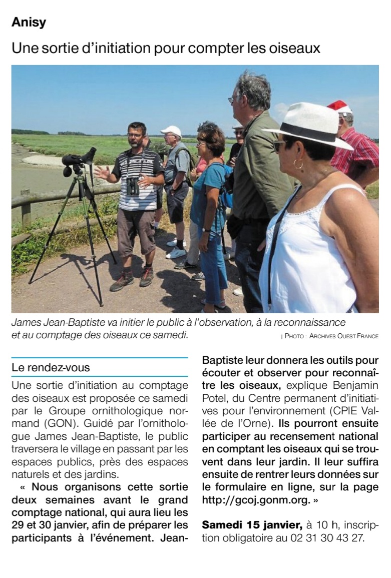 Comme chaque année désormais, un certain nombre d'articles paraît dans la presse pour annoncer l'événement et des animations de préparation au grand comptage. Un des premiers concerne Anisy (14) où une animation était prévue le 15/01/2022, organisée par le CPIE de la vallée de l'Orne et le GONm. L'image d'illustration est quelque peu anachronique mais, comme on l'entend beaucoup, c'est ça le réchauffement climatique.