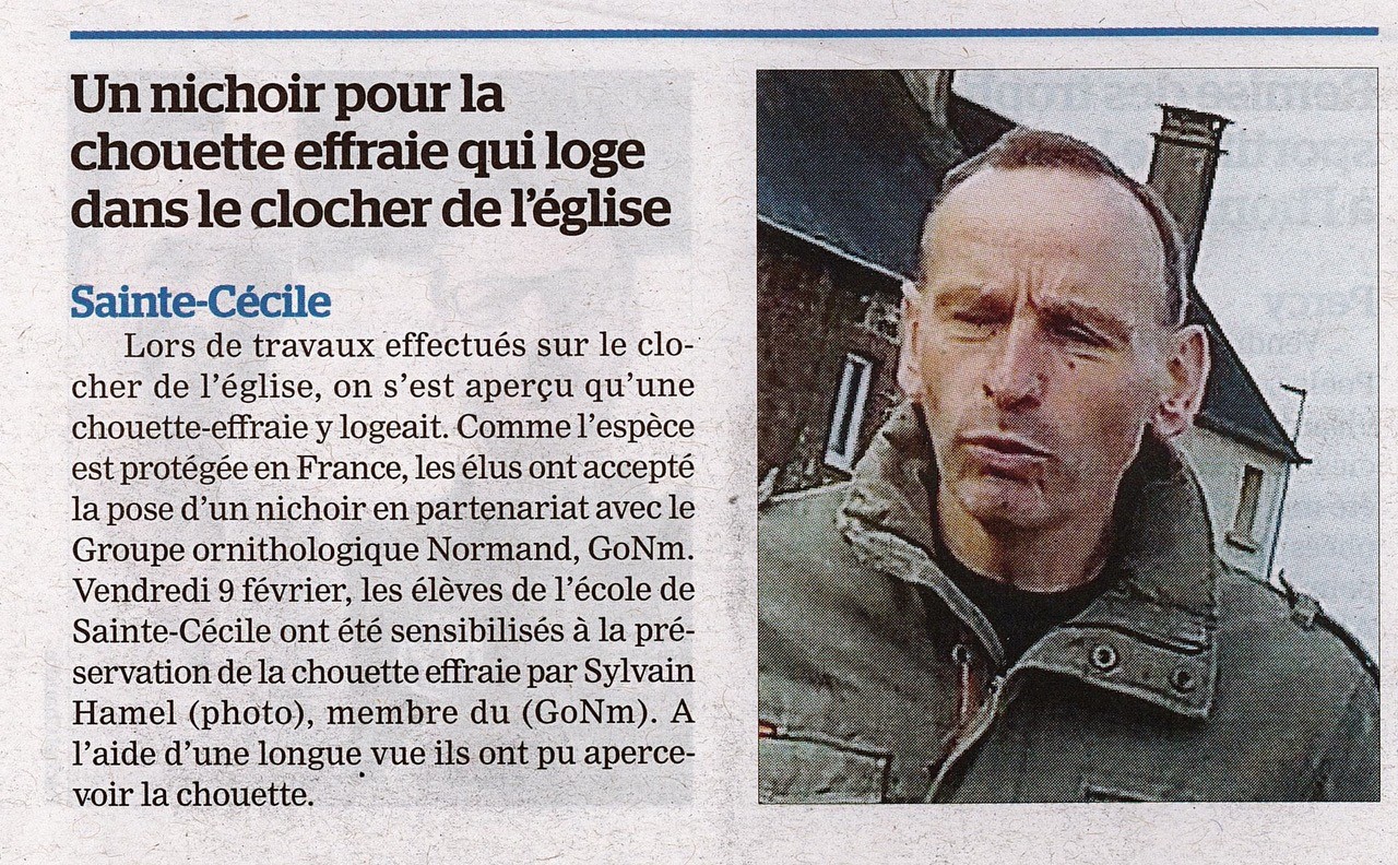 C'est à Sainte-Cécile/50, commune limitrophe de Villedieu-les-Poëles que l'installation de ce nichoir à effraie des clochers a été réalisée par Sylvain Hamel administrateur du GONm. Les scolaires ont été informés par une intervention de Sylvain dans l'école de la commune.